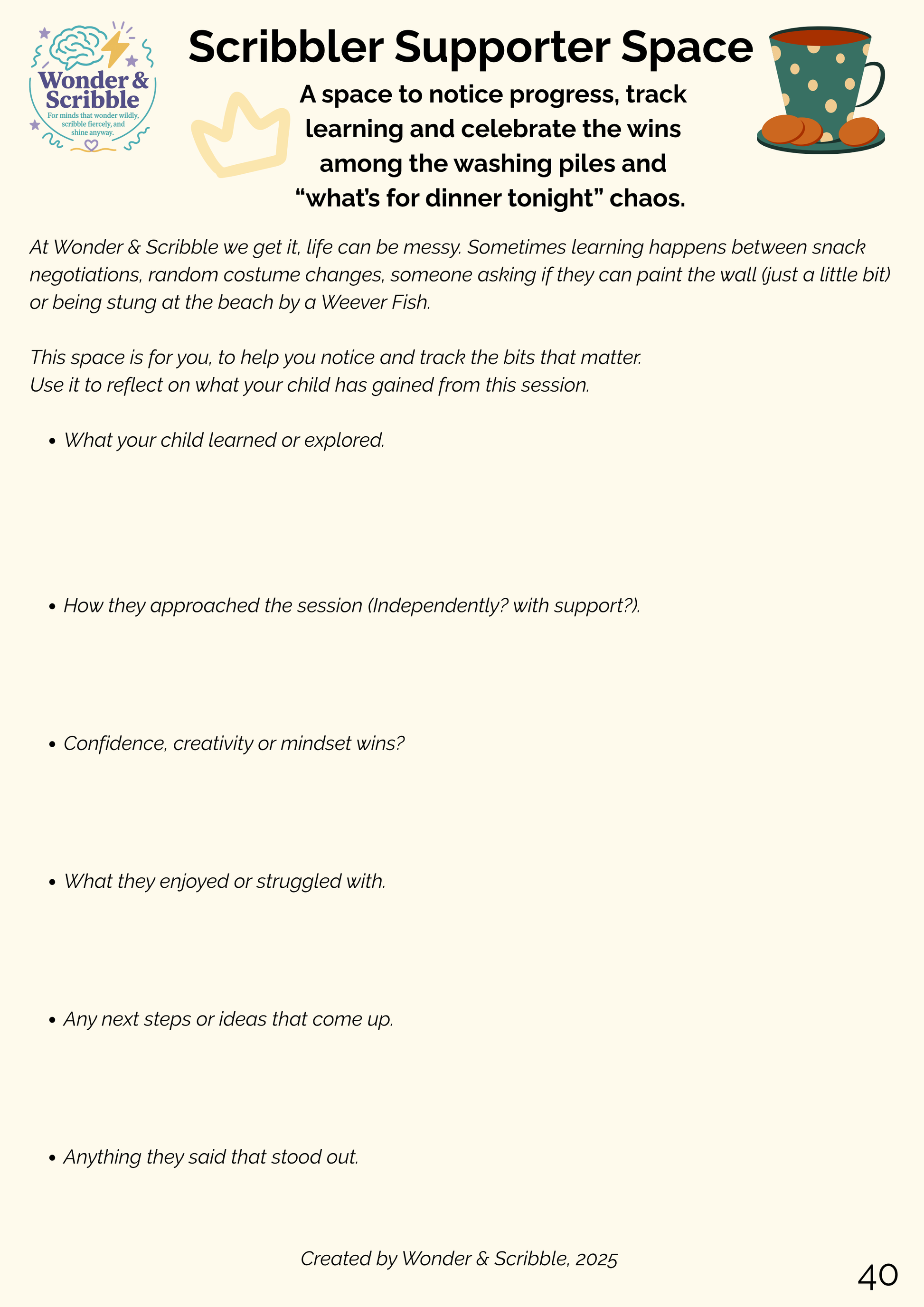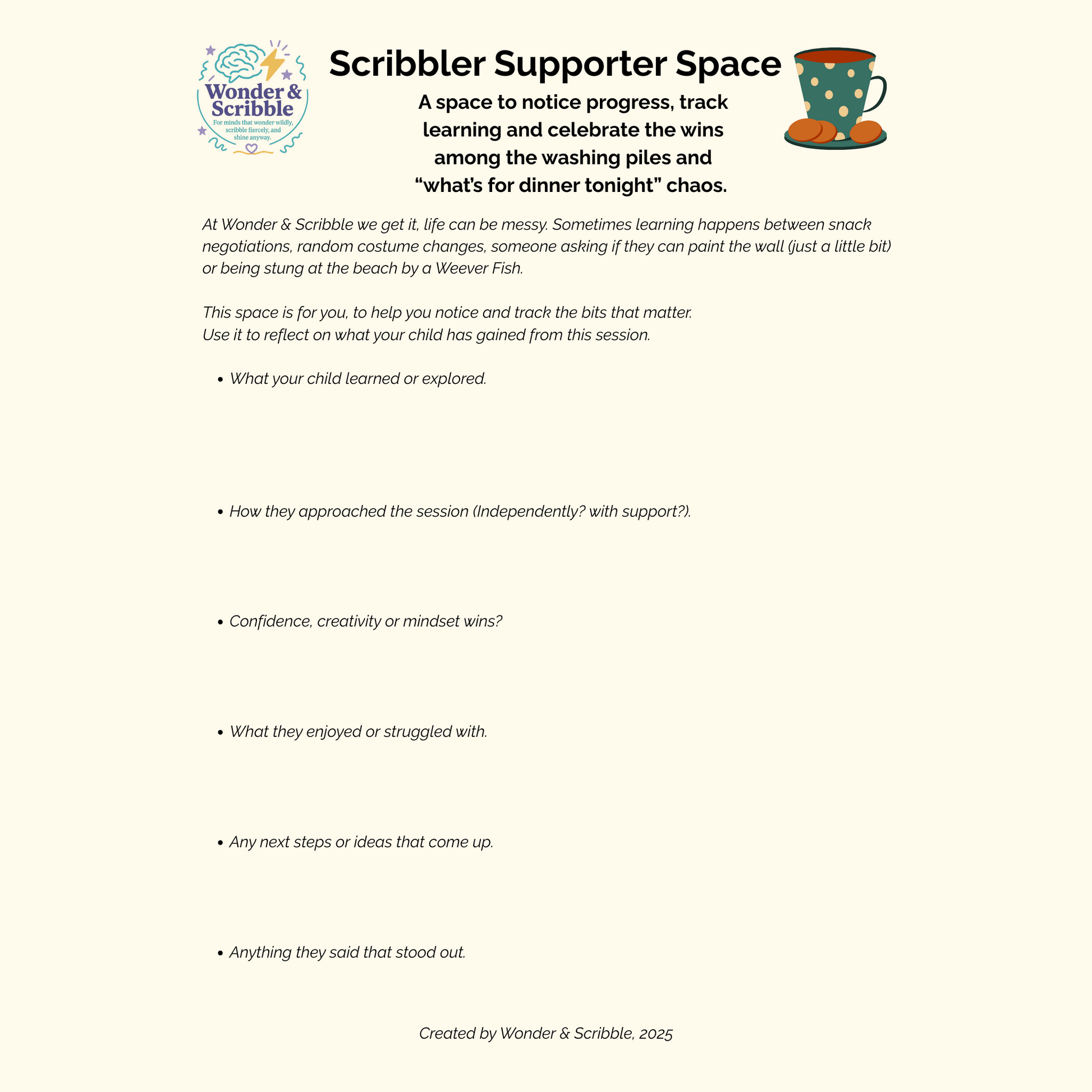 printable ‘Scribbler Supporter’ pages to track progress and celebrate wins